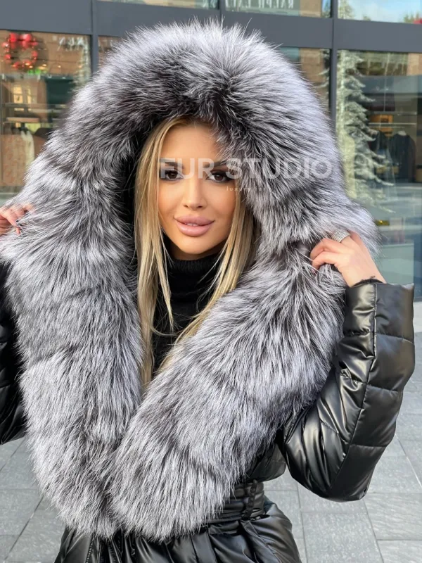 Чёрное пуховое пальто с меховым капюшоном 100223