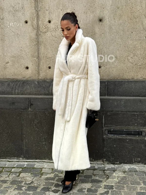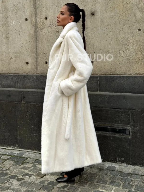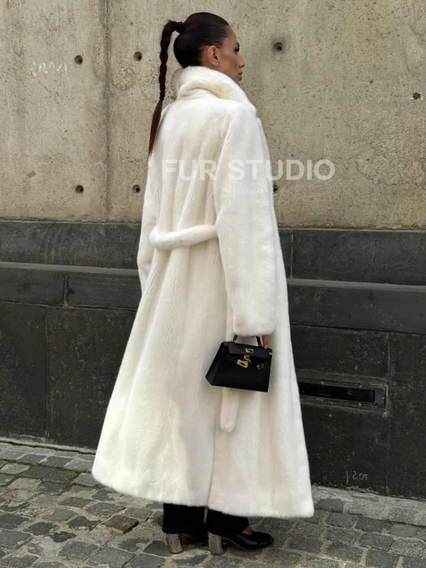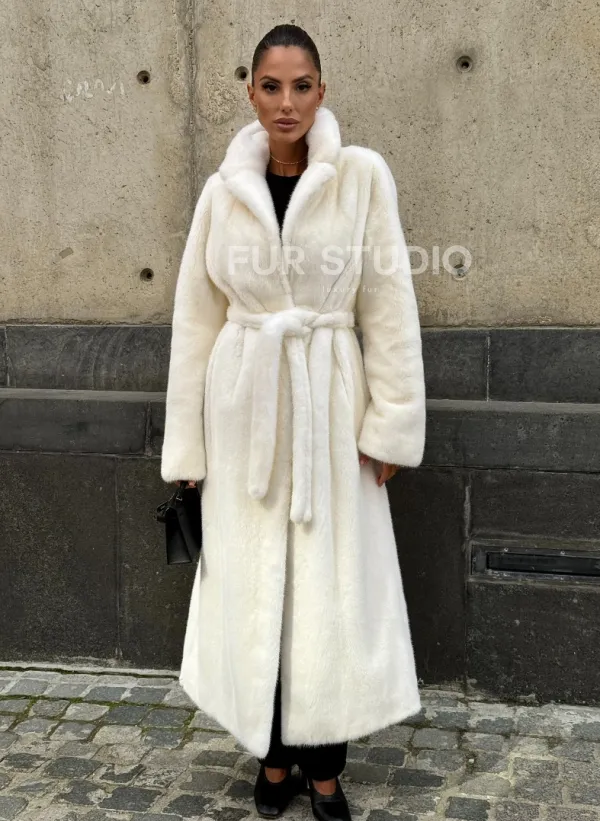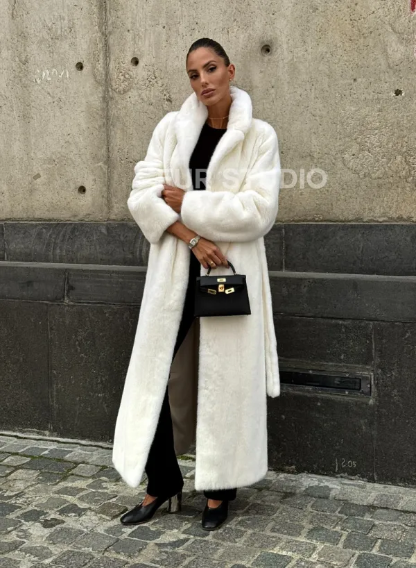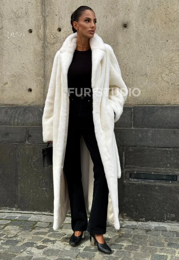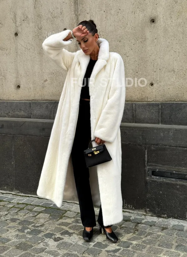 Роскошные рукава добавляют изысканности модели. Шикарные карманы позаботятся о комфорте ручек. Миниатюрная сумочка и грубая обувь сделают ваш образ гармоничным. Качество изделия будет радовать многие годы. Купить белую шубу из плюшевой норки с английским воротником могут дамы, которые обладают безукоризненным вкусом стиля.