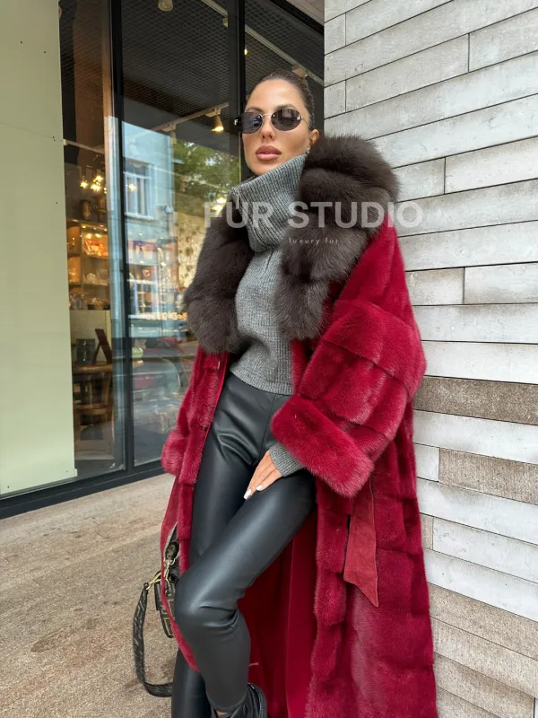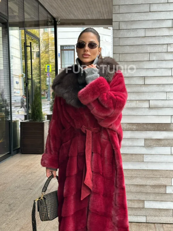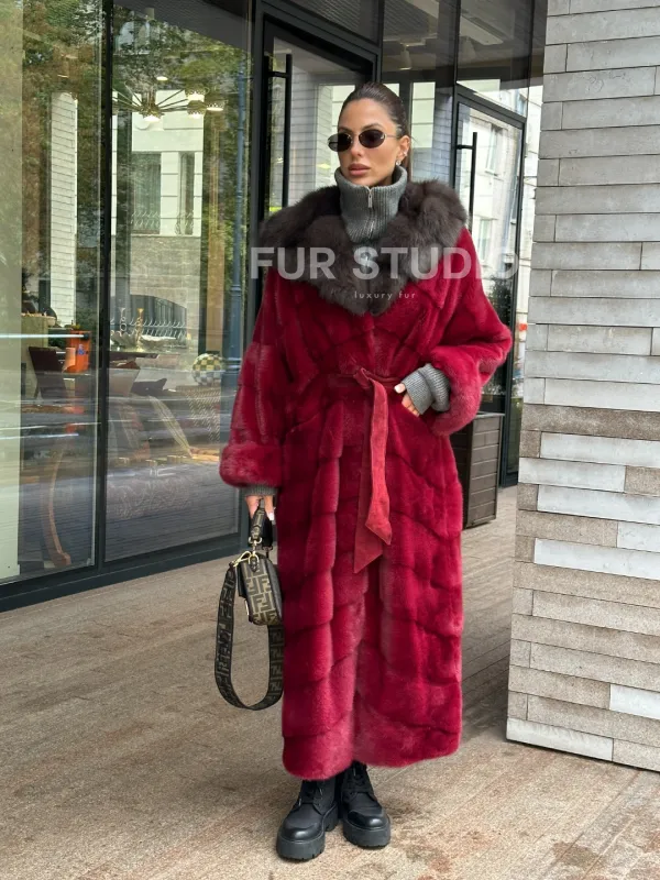 Мех данной шубы аукционная норка, цвет бордовый. Предлагается в размерах от 40 до 50. Длина модели 125-130 см, что выгодно подчеркивает фигуру девушек. Эта модель идеально подойдет для девушек и женщин, предпочитающих роскошные натуральные меха.