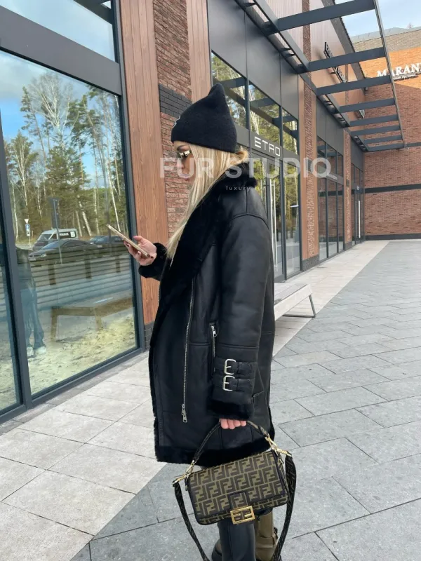 Дубленка авиатор удлиненная – тренд этого года. Модель прекрасно подходит всем девушкам вне зависимости от их возраста и типа фигуры. Удлиненное изделие зрительно увеличивает рост владелицы и скрывает недостатки силуэта. Шикарный воротник позаботится о комфорте шеи. Теплая подкладка не даст замерзнуть в холодную зиму. Ремешки на рукавах делают образ экстравагантным.