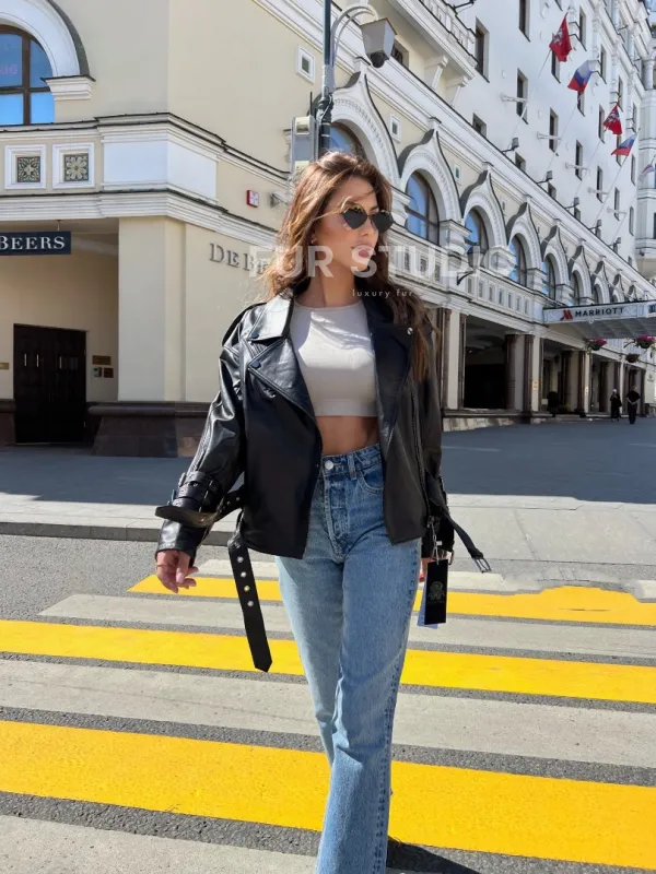 Кожаная куртка авиатор – хит этого сезона. Модель актуальна в любое время года и никогда не выйдет из моды. Натуральная кожа безумно мягкая и практически невесома. Носить ее одно удовольствие. Декоративные ремни на рукавах делают образ немного грубым и дерзким, но несмотря на это вы будете выглядеть женственно.