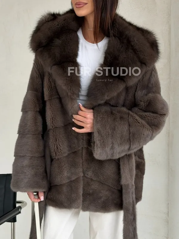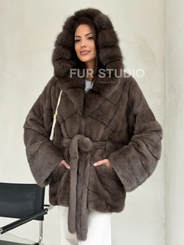 Меховой норковый полушубок с капюшоном куница 102689