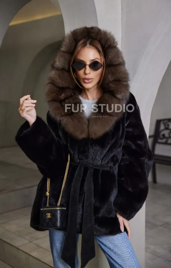 норка в роспуск шуба - черная с капюшоном куница 100779