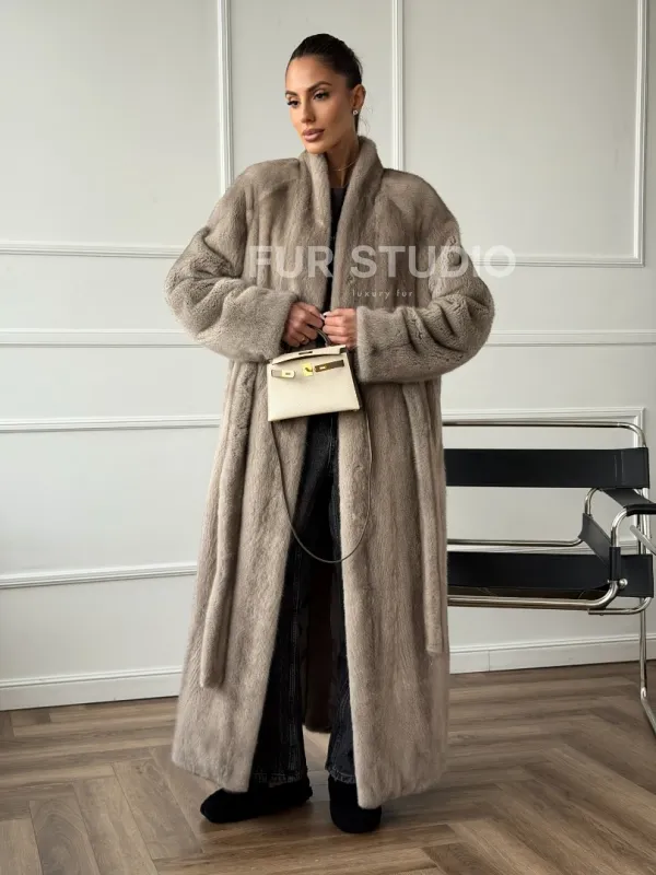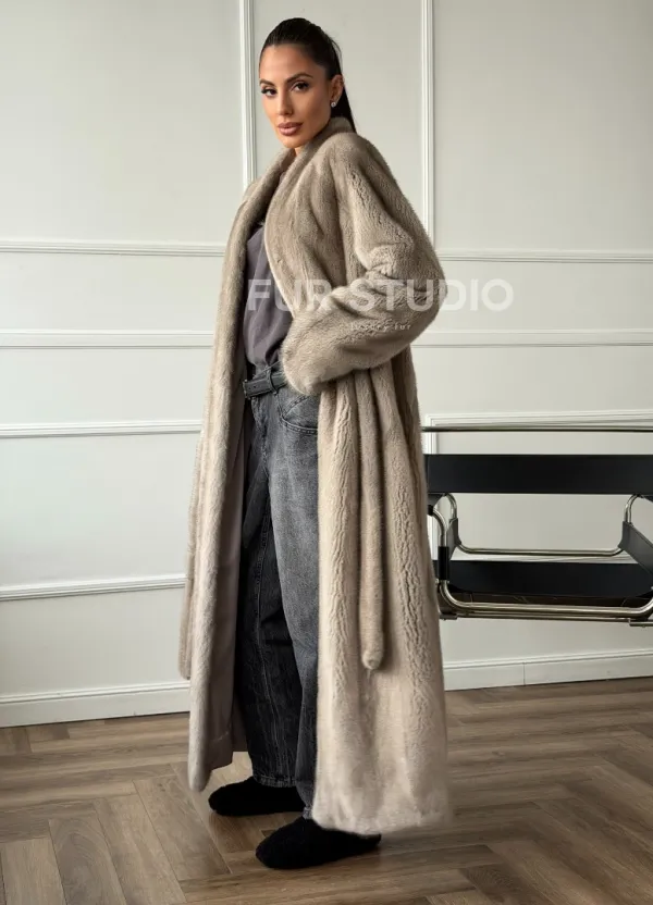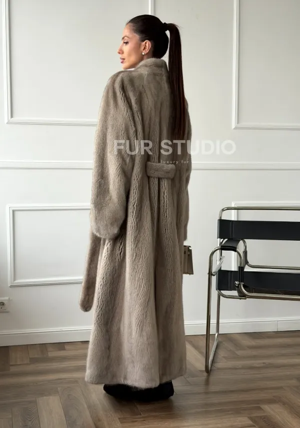 Мех данной шубы аукционная норка, цвет серый. Предлагается в размерах от 42 до 52. Длина модели 125-130 см, что выгодно подчеркивает фигуру девушек. Эта модель идеально подойдет для девушек и женщин, предпочитающих роскошные натуральные меха.