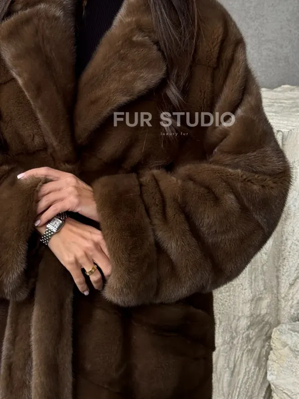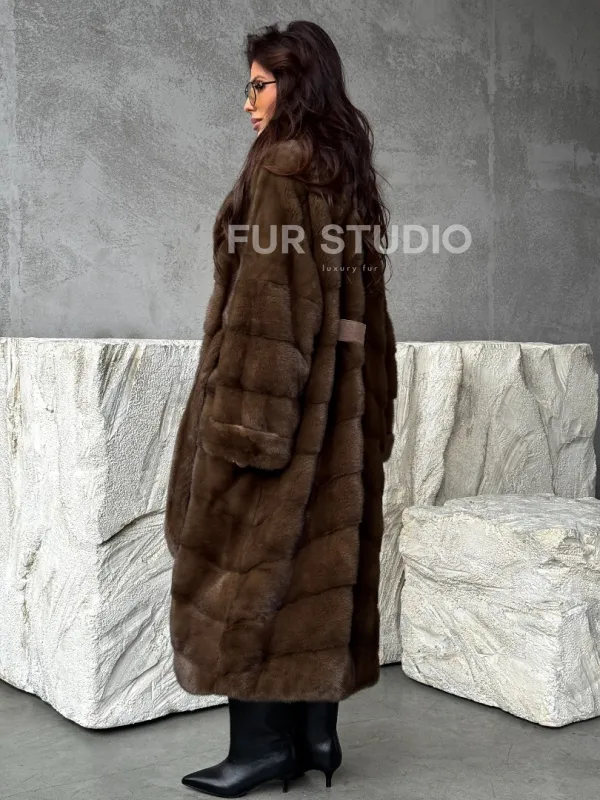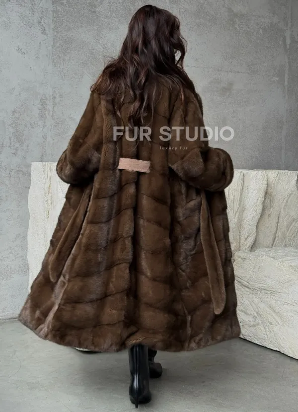 Мех данной шубы аукционная норка, цвет коричневый. Предлагается в размерах от 42 до 54. Длина модели 115-120 см, что выгодно подчеркивает фигуру девушек. Эта модель идеально подойдет для девушек и женщин, предпочитающих роскошные натуральные меха.