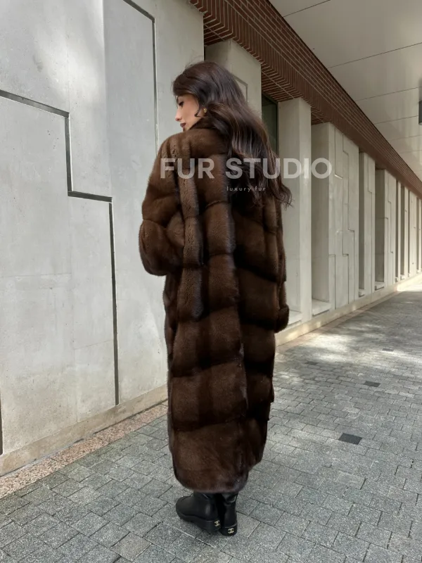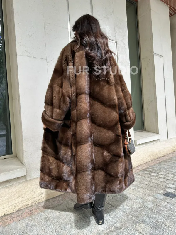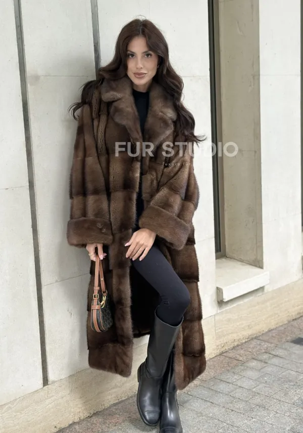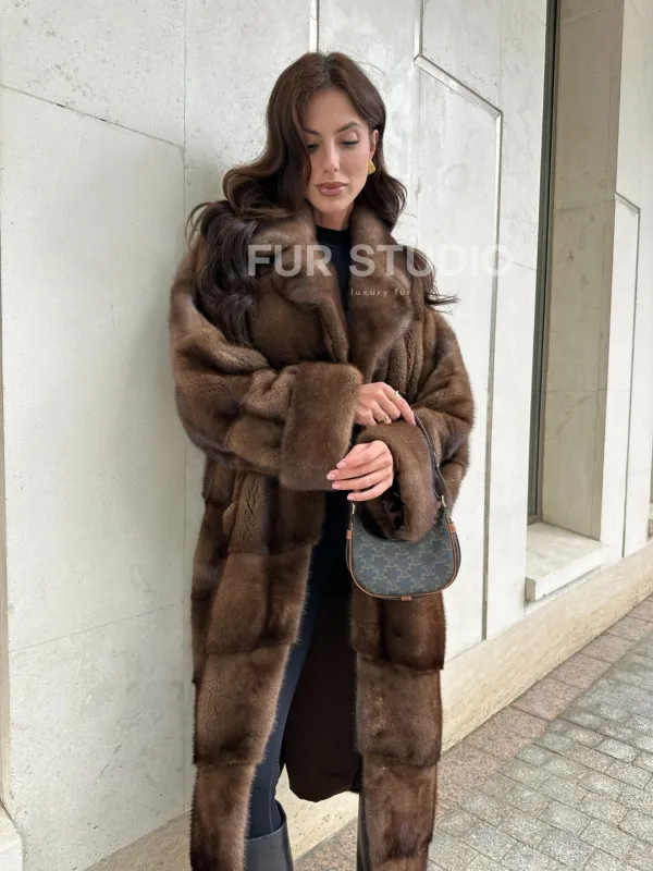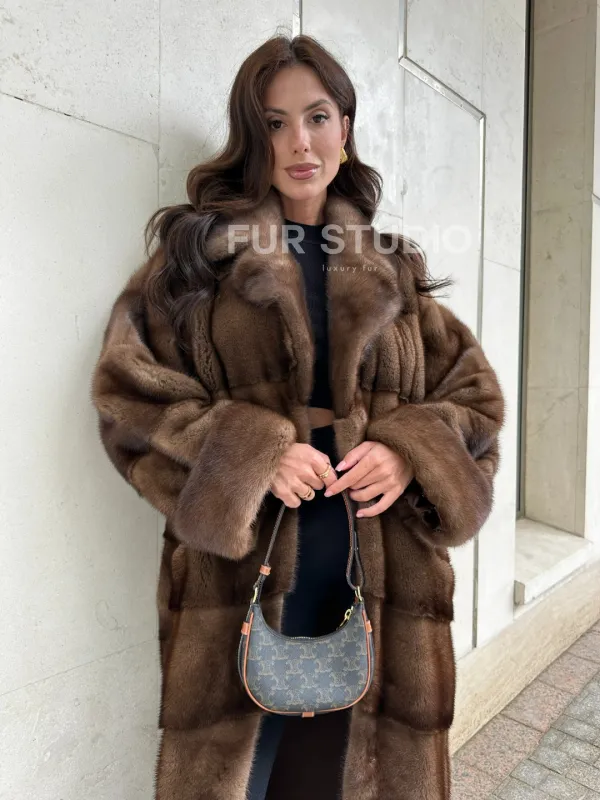 Мех данной шубы аукционная норка, цвет коричневый. Предлагается в размерах от 42 до 66. Длина модели 115-120 см, что выгодно подчеркивает фигуру девушек. Эта модель идеально подойдет для девушек и женщин, предпочитающих роскошные натуральные меха.