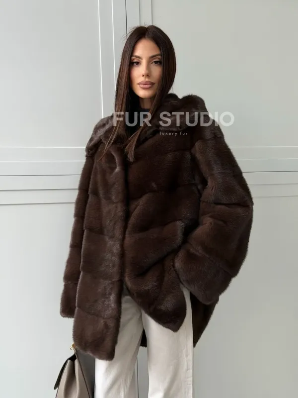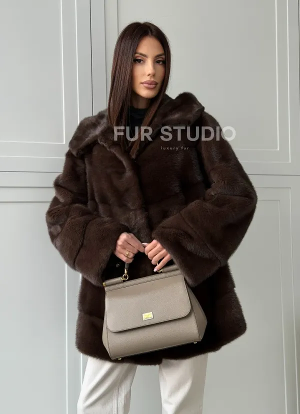 Норковая шуба в стиле «рубашка» с капюшоном 102826