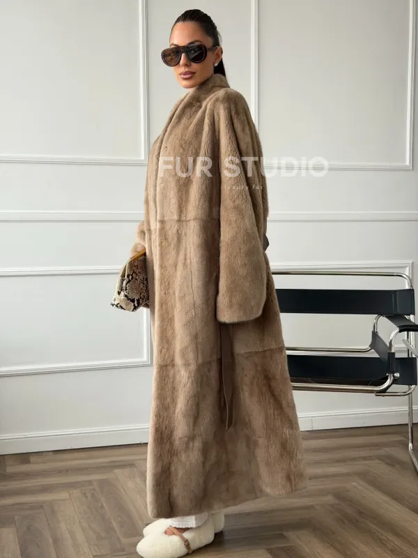 Мех данной шубы аукционная норка, цвет бежевый. Предлагается в размерах от 42 до 48. Длина модели 120-125 см , что выгодно подчеркивает фигуру девушек. Эта модель идеально подойдет для девушек и женщин, предпочитающих роскошные натуральные меха.
