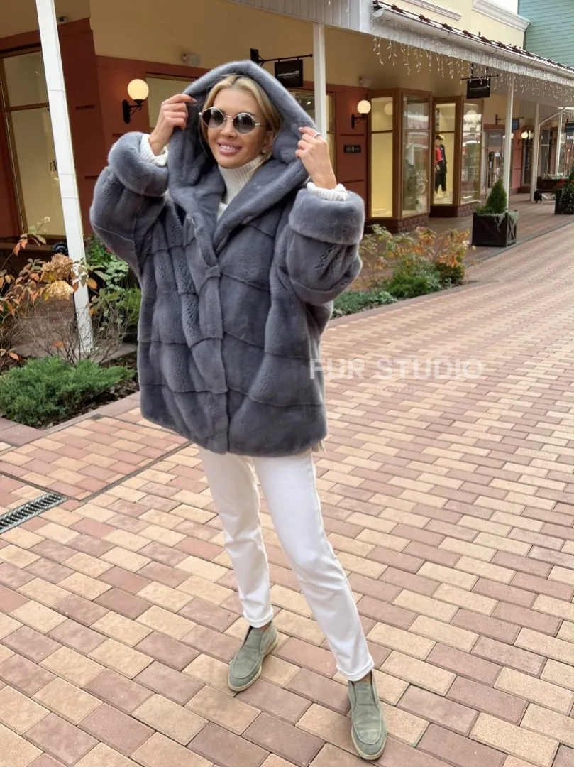 Удобные карманы сохранят тепло ручек. Прямой крой изделия не сковывает движений и скрывает недостатки. Модель удобна, если вы водите машину. Изделие сочетается с базовым гардеробом, подойдет под вечерний look. Добавьте к образу стильную сумочку и оригинальную обувь, вы готовы покорять мир. Купить норковое пончо с капюшоном в цвете графит могут женщины с изысканным вкусом.
