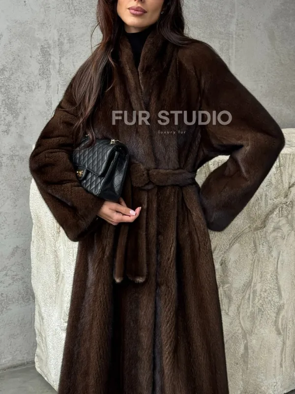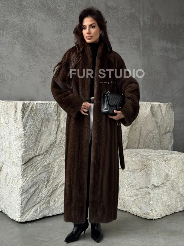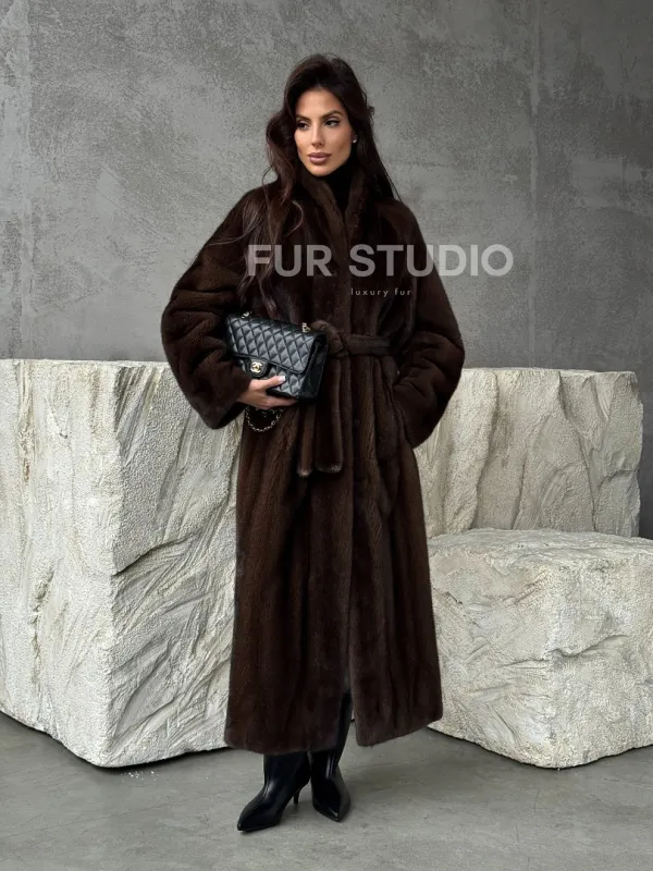 Мех данной шубы аукционная норка, цвет коричневый. Предлагается в размерах от 42 до 50. Длина модели 125-130 см, что выгодно подчеркивает фигуру девушек. Эта модель идеально подойдет для девушек и женщин, предпочитающих роскошные натуральные меха.