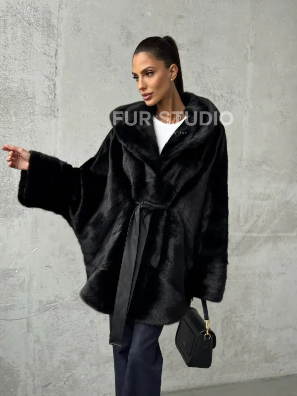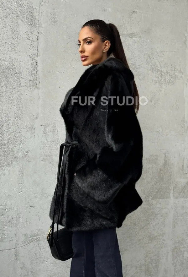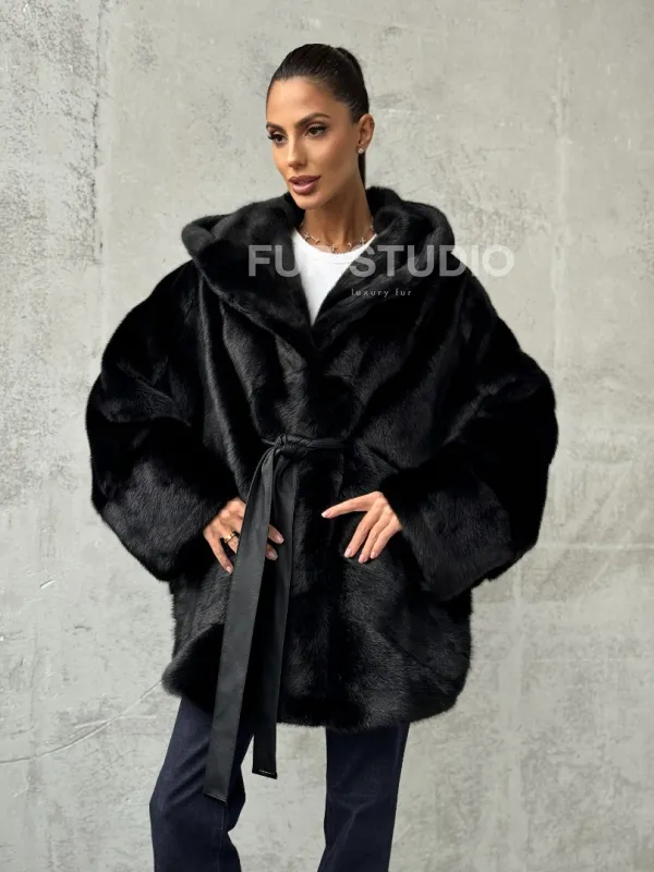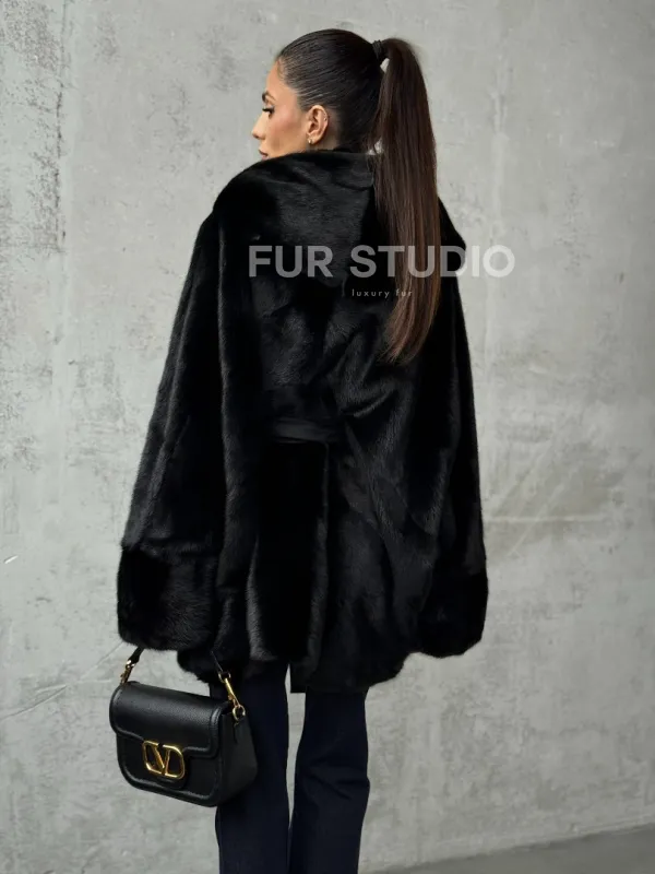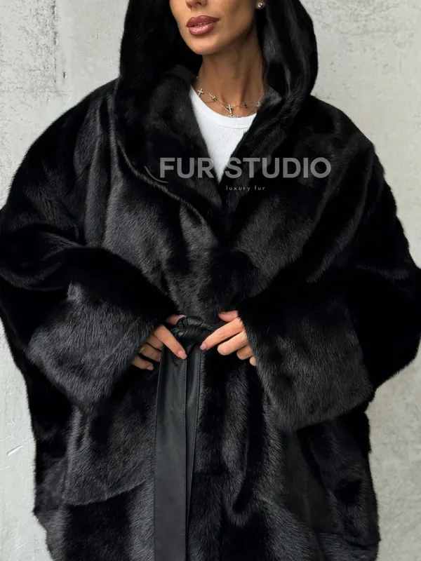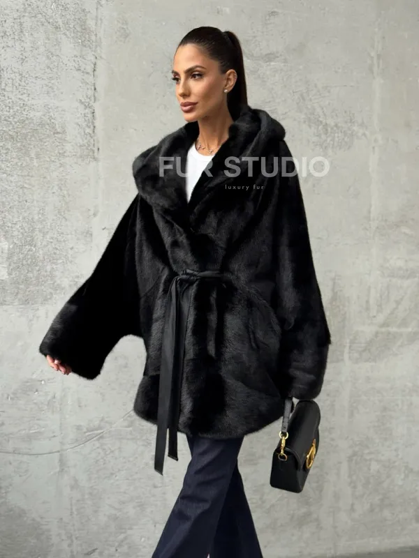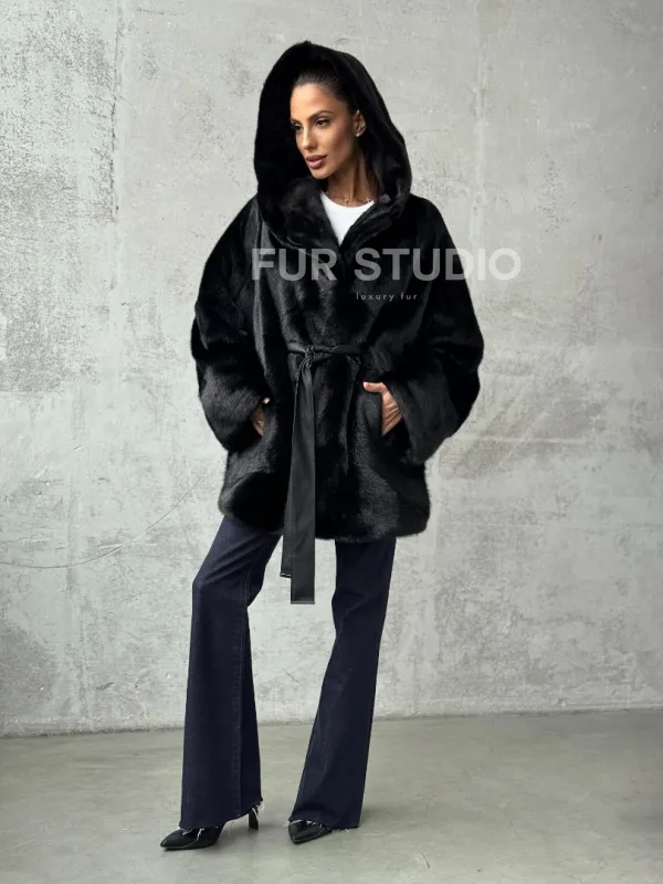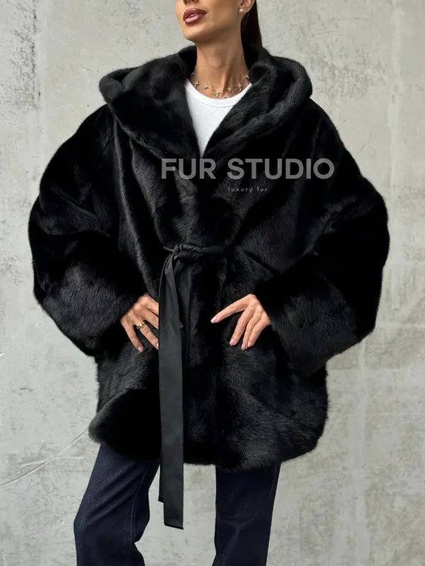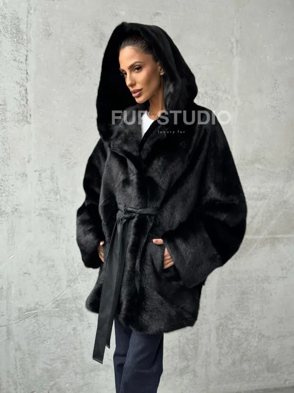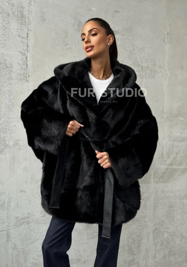 Полушубок черный норковый с капюшоном 102447