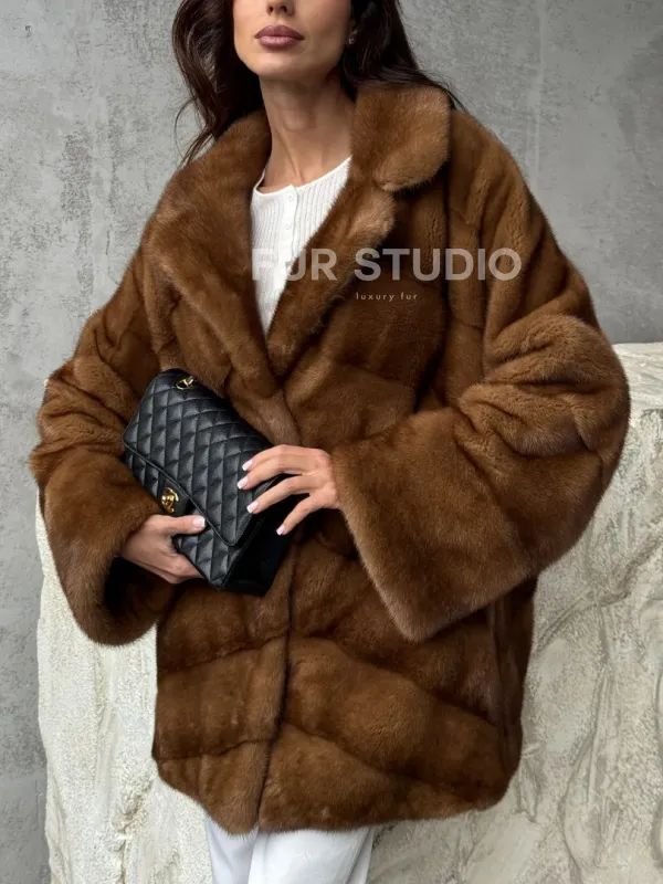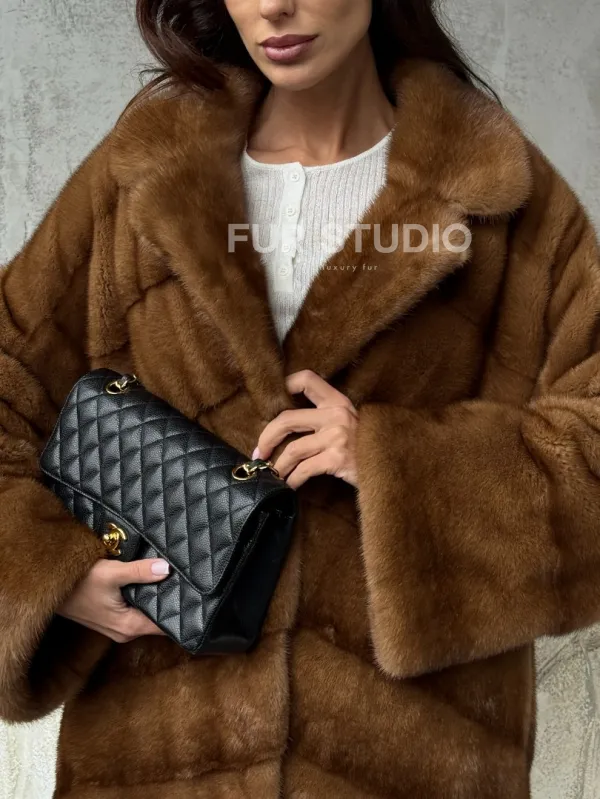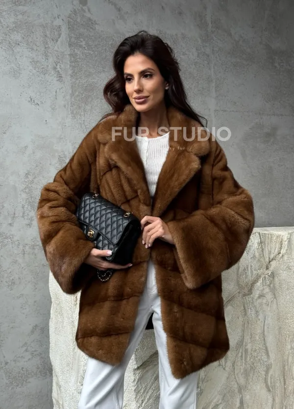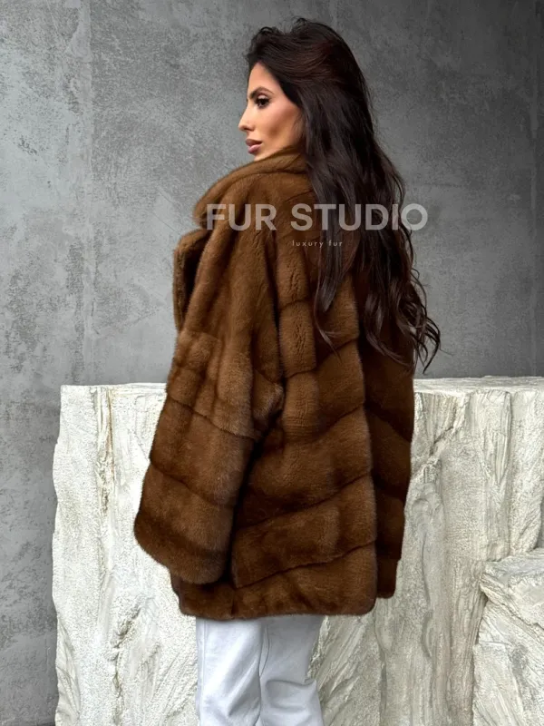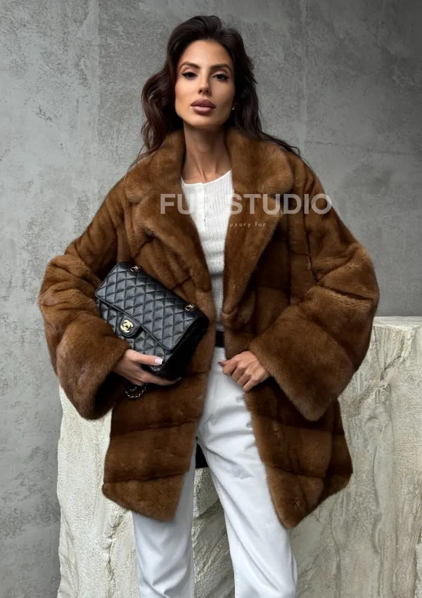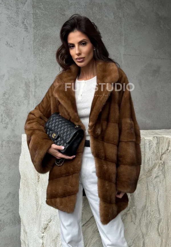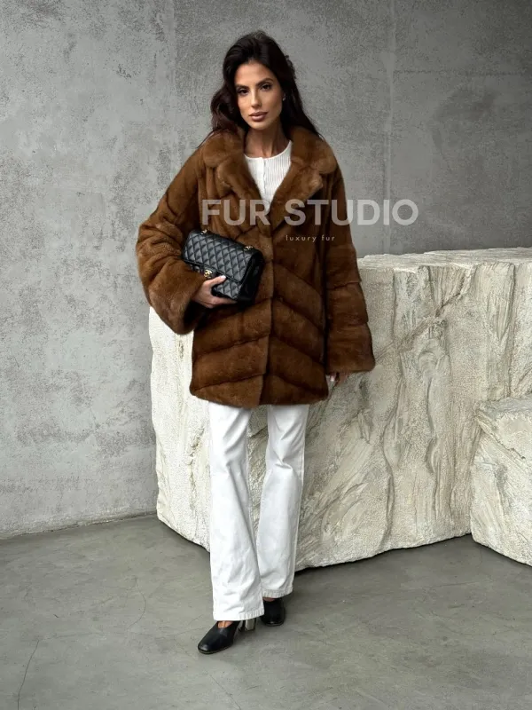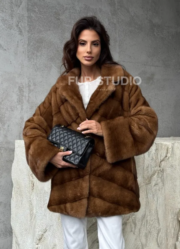 Мех данной шубы аукционная норка, цвет коричневый. Предлагается в размерах от 42 до 50. Длина модели 70-75 см, что выгодно подчеркивает фигуру девушек. Эта модель идеально подойдет для девушек и женщин, предпочитающих роскошные натуральные меха.