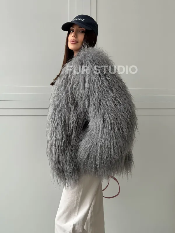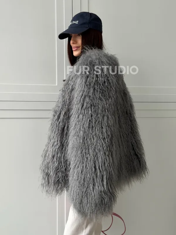 Серая шуба из натурального меха ламы 102811