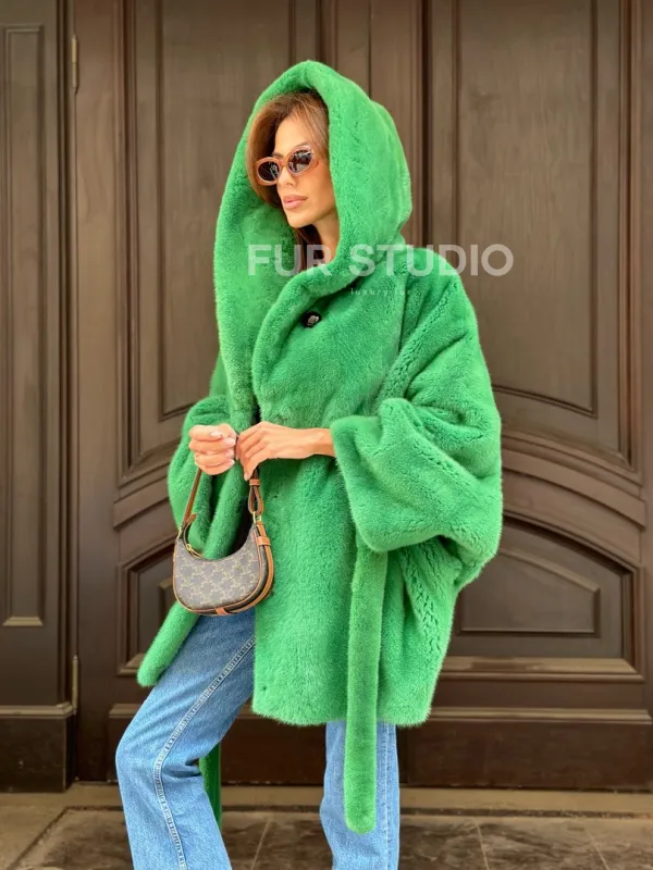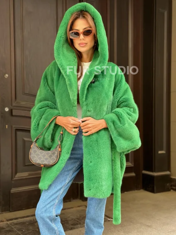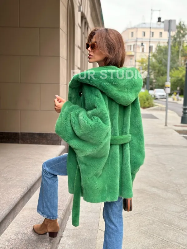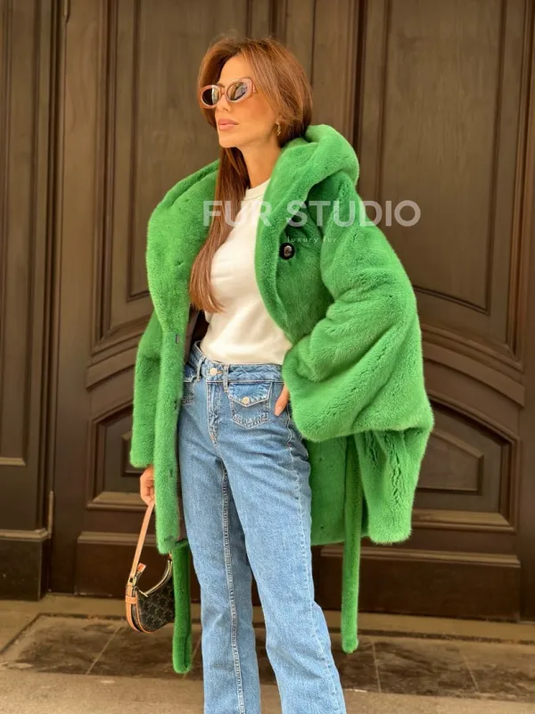 Мех данной шубы аукционная норка, цвет зеленый. Предлагается в размерах от 42 до 52 пошив по индивидуальным меркам. Длина модели 75-80 см, что выгодно подчеркивает фигуру девушек. Эта модель идеально подойдет для девушек и женщин, предпочитающих роскошные натуральные меха.